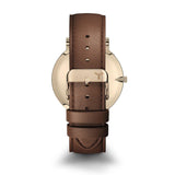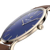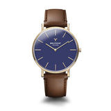 Classic and contemporary, our Jarvis is the perfect everyday accessory. The slim two-hand watch features a midnight blue watch face with stainless steel gold hour markers and a gold frame. Finished with a luxury brown Horween Leather band, this minimal watch is a timeless piece you'll never tire of.