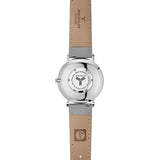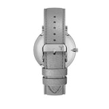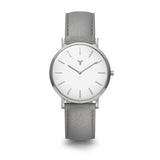 Designed for the modern woman, this sophisticated 36.5mm timepiece is complemented by our environmentally conscious vegan leather watch strap. Designed in Chicago, this minimal watch features a clean white dial set in a polished silver case with matching hands and elevated hourly tick marks to complement any wardrobe. The featured animal-friendly vegan leather strap is interchangeable for a look that’s sure to make a statement.