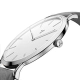 6.5mm thick and 36.5mm diameter. We engineered it to be as slim as possible. This two-hand watch can easily be the most versatile timepiece in your wardrobe, making it perfectly suited for a board meeting or Sunday brunch.