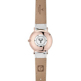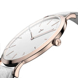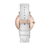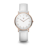 Designed for the modern woman, this sophisticated 36.5mm timepiece is complemented by our environmentally conscious vegan leather watch strap. Designed in Chicago, this minimal watch features a clean white dial set in a polished rose gold case with matching hands and elevated hourly tick marks to complement any wardrobe. The featured animal-friendly vegan leather strap is interchangeable for a look that’s sure to make a statement.