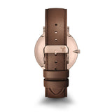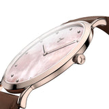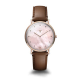 Freshen up your look with our slim two-hand watch. This luxury Horween Leather watch features a polished look with a liquid peach watch face and slim hour markers in a stunning bronze gold finish. Complete with a brown Horween Leather band, this minimal watch will dress up your casual or office wear with its stunning sophistication.